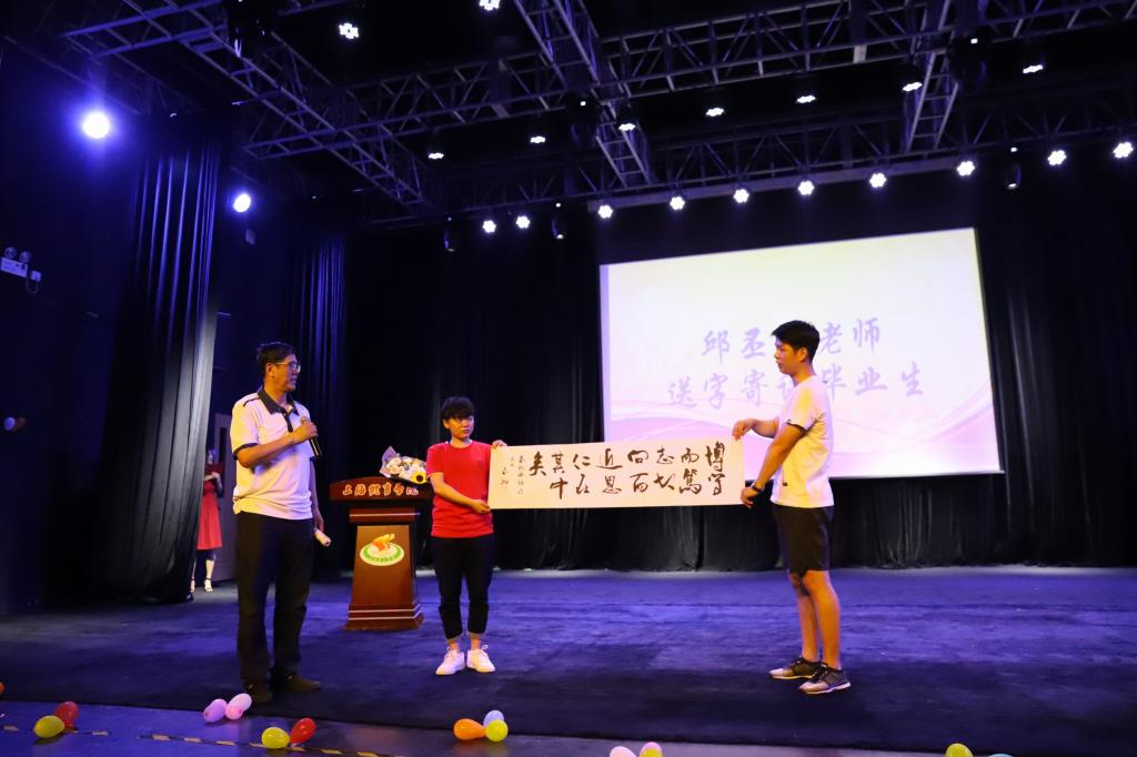 仪式最后,2018届全体毕业生表达了对学校多年培养的感激之情,毕业生代表登台向导师、班主任献花,并向学院赠送的工艺纪念品,表达感恩之情。霍圣录代表武术学院接受同学们赠送的工艺纪念品,并向毕业生们表达真挚的感谢与祝福。