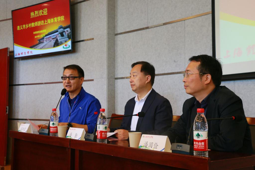 欢迎会上,潘勤对遵义市教师代表团表示热烈欢迎,并与各位教师就学校人才培养、科学研究、社会服务等方面进行互动交流。他指出,遵义是“遵义会议”召开地,也是上海的对口支援城市。上海体育学院作为体育类高等学府,可以在探索发展红色体育旅游产业上,更好的优化当地的经济发展模式。