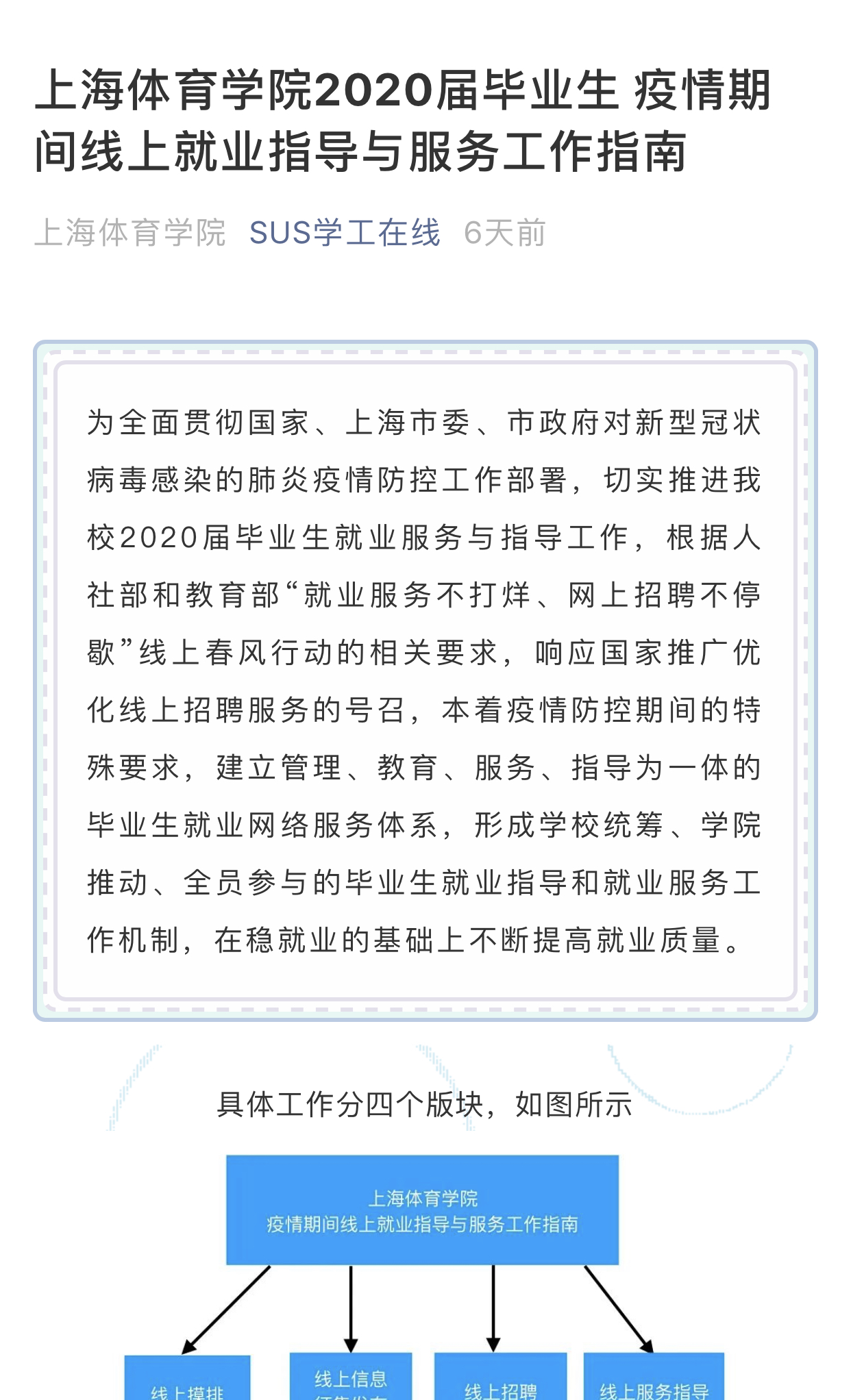 根据学校党委要求,我校在第一时间制定了疫情防控期间的就业工作方案,并制作了暖心的“线上就业”工作指南,建立管理、招聘、教育、服务、指导为一体的毕业生就业网络服务体系,筹办线上招聘会、空中双选会,为毕业生就业保驾护航。上体学工也制定了特殊时期的心理、资助专项工作方案,积极开展心理疏导和人文关怀,落实线上心理防护援助服务、网络宣传与舆论引导、资助帮扶等相关工作。辅导员们每天关心指导学生的成长发展,全力帮扶指导学生普遍关心的考研复试、就业创业、心理咨询、生涯规划、千方百计保障学生成长“不掉线”。体训学院辅导员王晓云通过线上会议,给予同学相关就业指导。传艺辅导员王乐积极组织学生观看《大学生心理应激与应对》系列讲座,动员全年级学生并和大家共同学习,每天带头学习做笔记。让学生们不仅学习到了疫情心理应激管理与自助的实用知识,也在逐步培养学生利用假期、线上学习的好习惯。