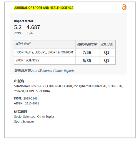 本网讯 北京时间2020年6月29日,科睿唯安(Clarivate Analytics)公布了《期刊引证报告》(JCR)最新数据,我校主办的Journal of Sport and Health Science(中文刊名《运动与健康科学(英文)》)影响因子跃升至5.2(去年为3.644),学科排名亦大幅提高:在85种被SCI收录的体育类期刊中排名第5(去年排名第10),位于Q1;在56种被SSCI收录的运动、休闲、旅游类期刊中排名第7(去年排名第8),位于Q1。