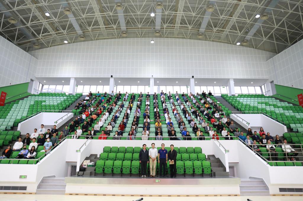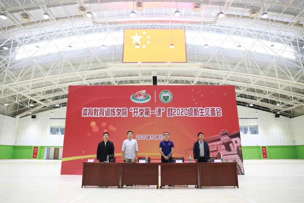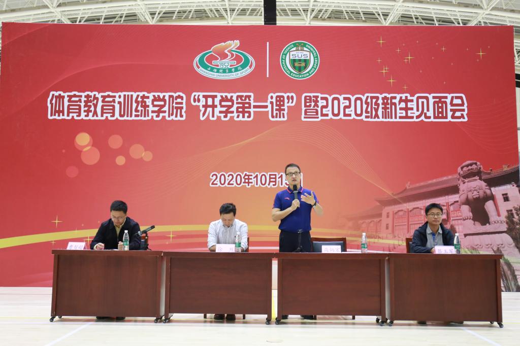 本网讯 10月15日上午,体育教育训练学院“开学第一课”暨2020级新生见面会在综合馆举行。体育教育训练学院党委书记徐烈,党委副书记、院长高炳宏,党委副书记、副院长曹智超,副院长蔡玉军出席会议,后勤处、保卫处等相关部门老师、研究生辅导员、教学秘书和全体2020级硕博研究生参加会议。会议由党委副书记、副院长曹智超主持。
