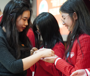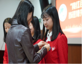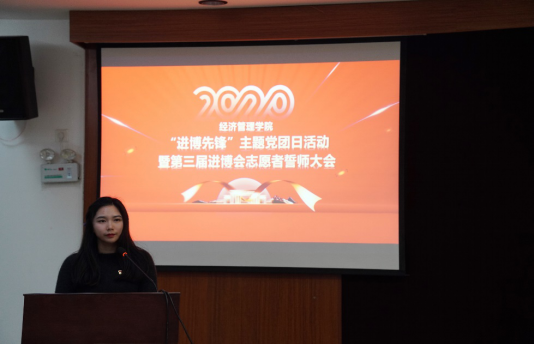 在“亮红色身份、当进博先锋”环节,研究生第一党支部书记张扬与经管学院团委书记于卓言分别为进博会志愿者党员、团员佩戴党徽和团徽。