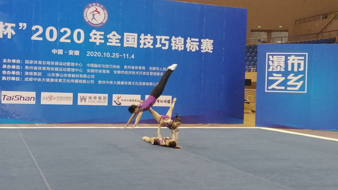 本网讯 2020年10月25至11月4日,全国技巧锦标赛在贵州省安顺市体育中心体育馆隆重举行。本次大赛由国家体育总局体操运动管理中心、中国蹦床与技巧协会主办,共有来自全国各地的500余名选手参赛。经过激烈的比拼,我校技巧队在青年组1级女子三人(与广西联合组队)项目取得平衡套、动力套、全能三个第一,青年组2级女子三人、混合三人项目中取得第一、混双项目中取得第四的优异成绩。院技巧队在训竞处、体育教育训练学院、中国体操学院领导的关心支持下,在教练员和运动员的共同努力下,运动员们傲然绽放于赛场,充分展示了上体人的实力和精神风貌,为我校争得了荣誉。