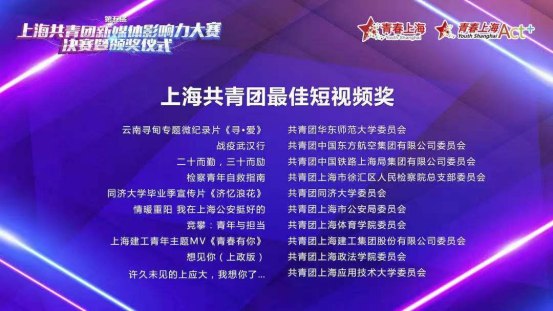 我校团委报送的“竞攀:青年与担当”获得本次大赛“上海共青团最佳短视频奖”,也是第一次斩获共青团媒体类奖项。本次报送的新媒体短视频作品,以“一二·九”运动85周年为内容主题,以沙画为制作载体,从构思、设计到脚本,倾注了团队的心血,在2分07秒的流动画面中,每一帧都体现了青年对国家、民族的责任与担当。