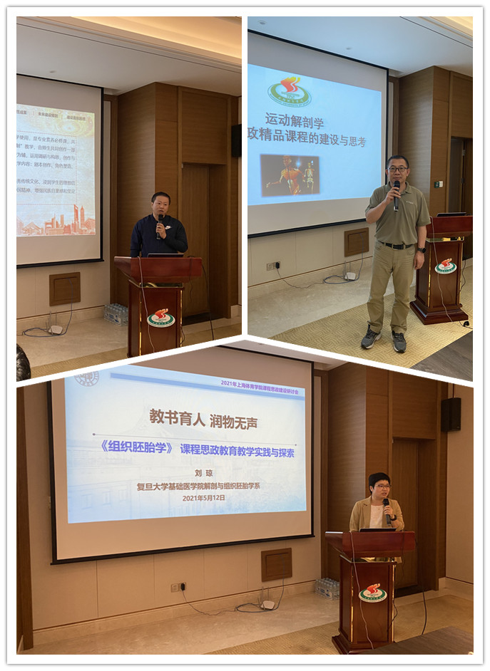 本次研讨会以“聚焦课程思政建设,提升教师育德能力”为主题,邀请复旦大学基础医学院刘琼教授、我校课程思政精品课程建设负责人代表运动科学学院于新凯教授、武术学院王继强老师做主题发言。刘琼教授以“教书育人润物无声--《组织胚胎学课程思政教育教学实践与探索”为题,从教学设计入手,挖掘医学专业课程中的课程思政元素,将专业知识紧密联系临床实践,将前沿文献引入课堂讨论,将复旦前辈事迹及学科发展历史融入课程教学,将医学人文精神、科学精神、职业素养与大医精诚的医学精神贯穿整个课程之中。关注学生学习效果,定期开展问卷调查,通过学生学习反馈,不断调整教学内容、进度,做到育人功能与专业知识互为表里、交织交融。于新凯教授介绍《运动解剖学》课程基本情况,紧抓上海市课程思政领航学院的发展机遇,深挖课程思政元素,梳理出专业知识内容与思政维度,通过以致敬张汇兰先生,传递爱国主义情怀为主轴,依托重修教学大纲,整改育人目标,扩增教学团队教师参与度,加强教学团队课程思政学习交流,开展混合式教学,拓展学生第二课堂等多元化措施打造既有“温度”又有“深度”具有上体特色的《运动解剖学》课程思政。王继强老师以“青春正气筑红心德技兼修铸武魂”为题,介绍了《大剧目排演》课程创建的由来,讲述红色爱国主题的原创剧本《渔阳烽火》的排演全过程,展示师生共同创作一部完整的原创舞台剧的教学模式。通过以武术为载体将优秀传统文化所蕴含的德育元素、爱国主义为核心的民族精神和以改革创新为核心的时代精神贯穿剧本创作、角色塑造、演出呈现三大主题教学内容。帮助学生自觉以爱国主义为核心,弘扬中国精神、增强民族自豪感和坚定文化自信。