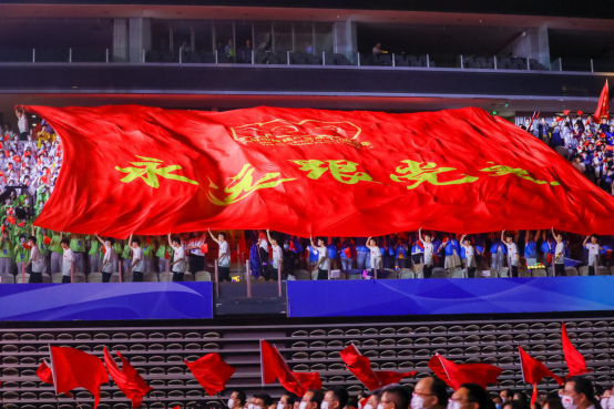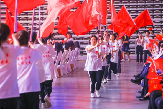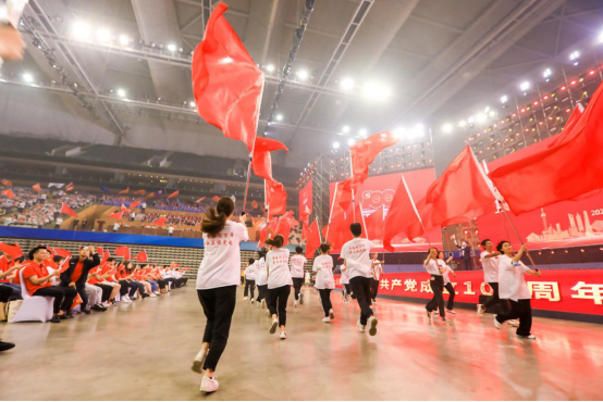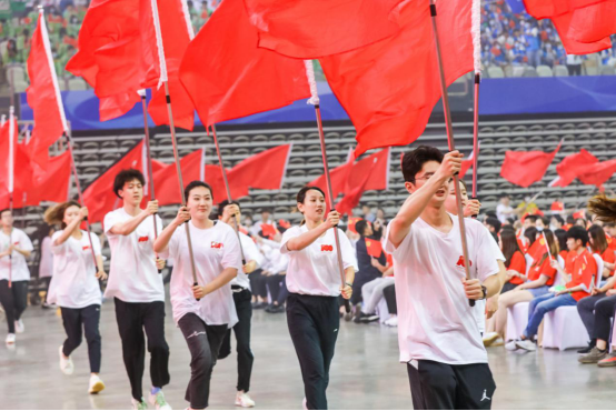 旗手节目组从接到表演邀请到现场表演,只有一周时间准备,来自于运动科学学院、武术学院、经济管理学院及校学生会等单位的近300名旗手分成“红旗表演团”和“各单位(学校)旗帜表演团”,将表演贯穿整场晚会,从开篇的《红旗颂》的有序出场、到尾声的《不忘初心》整体挥动,以及伴随主要节目来营造互动氛围的挥舞,还有观众参与感较强的绕场巨型红旗“永远跟党走”,都来自于我校参演代表热情洋溢的表演。他们虽然不在灯光耀眼的舞台上,但全程活跃于整个东方体育中心场馆内,没有互动环节时就耐心地“隐藏”在观众过道,一有表演就立马扛着红旗鱼贯而入、尽力挥舞,旗杆和旗帜就是青年的责任寄托,笑容和热情就是青年的青春写照。旗手节目组的表演可能没有独占几分钟的台上亮相,但为整场近100分钟的节目营造热络而昂扬的现场气氛。