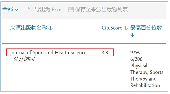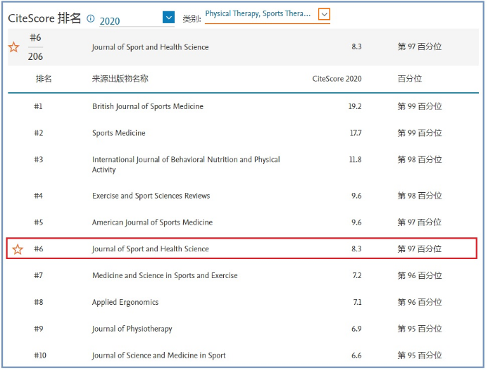 我校主办的《运动与健康科学(英文)》(Journal of Sport and Health Science)最新CiteScore为8.3(去年为6.3)。在两个细分学科领域具体表现为:在物理治疗、运动疗法、康复(PhysicalTherapy, Sports Therapy and Rehabilitation)学科收录的206种期刊中排名第6(6/206),进入前3%(去年为8/196,前4%);在骨科、运动医学(Orthopedics and Sports Medicine)学科收录的262种期刊中排名第8(8/262),亦进入前3%(去年为15/261,前6%)。