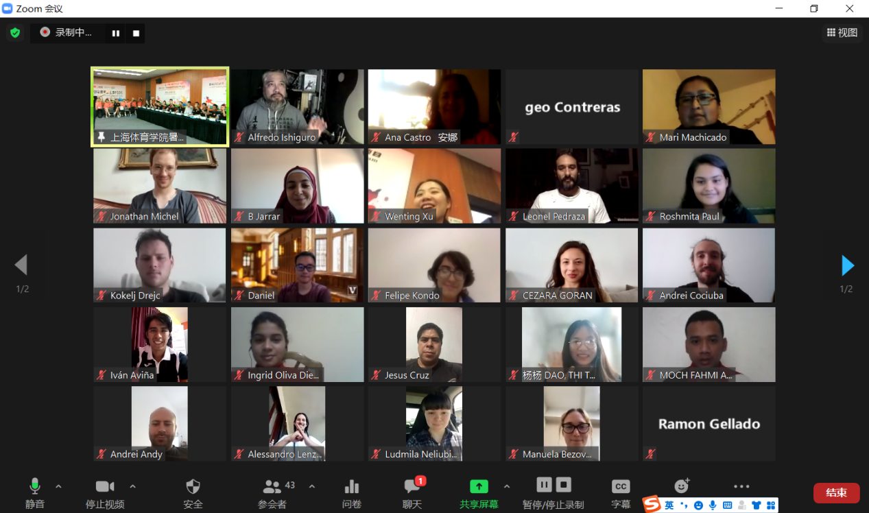 陈彬与大家一同回顾了上海体育学院以及暑期学校项目的发展历史。他讲到,上海是国际经济中心、金融中心、航运中心和贸易中心,目前正在加快建设全球科技创新中心。上海暑期学校旨在搭建与世界上不同语言文化之间的教育和人文交流平台,我校的武术、乒乓项目也已产生良好的传播效果和广泛的国际影响力。陈院长还介绍到,中国乒乓球学院是目前世界上唯一一所集教学训练、培训科研为一体的培养乒乓球高技术人才的高等学府,此次线上课程中乒院将为世界各地的乒乓爱好者提供线上教学和训练等内容,希望国际学员能够享受到乒乓球运动以及中国文化带来的乐趣。