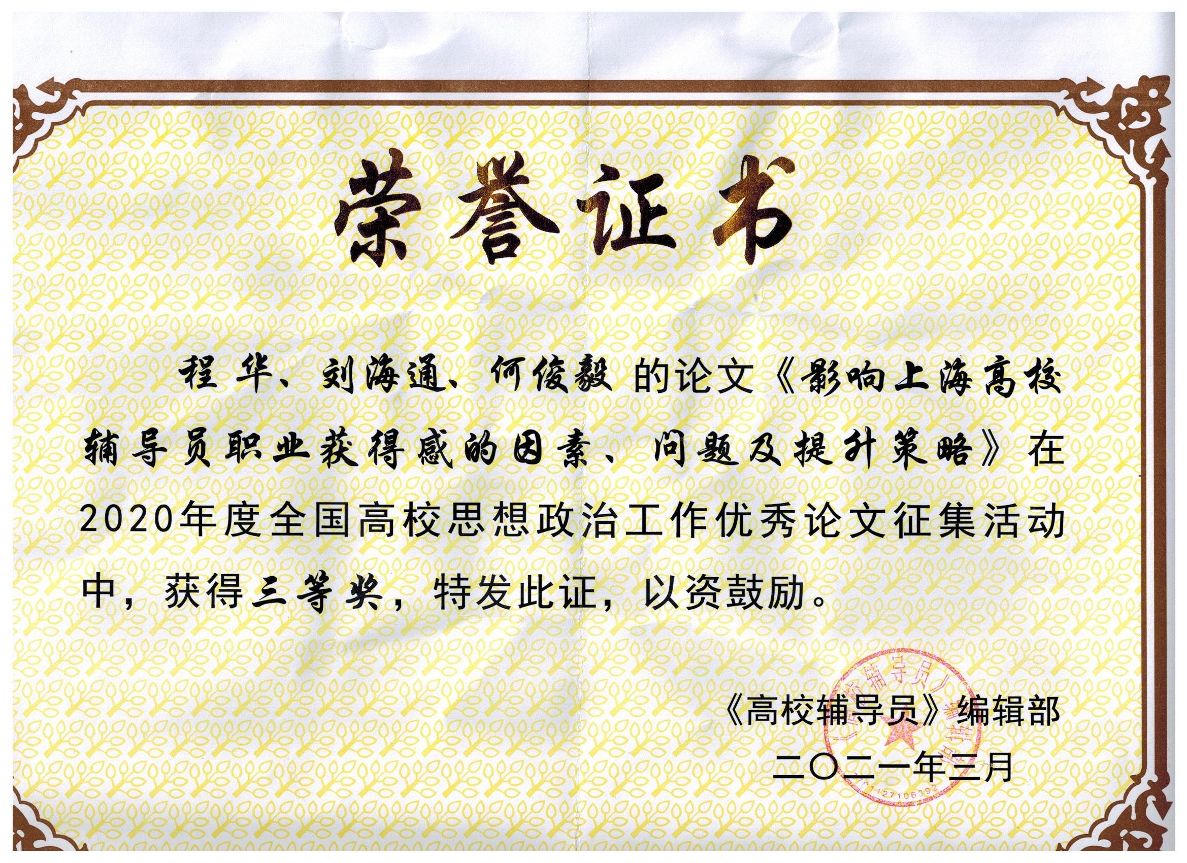 本网讯 2021年3月,2020年度全国高校思想政治工作优秀论文征集活动圆满谢幕。我校学(研)工部副部长程华、武术学院辅导员刘海通、体育教育训练学院辅导员何俊毅的合作论文《影响上海高校辅导员职业获得感的因素、问题及提升策略》在本次优秀论文评选中荣获三等奖,这也是体育院校中唯一获奖论文。