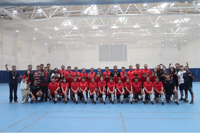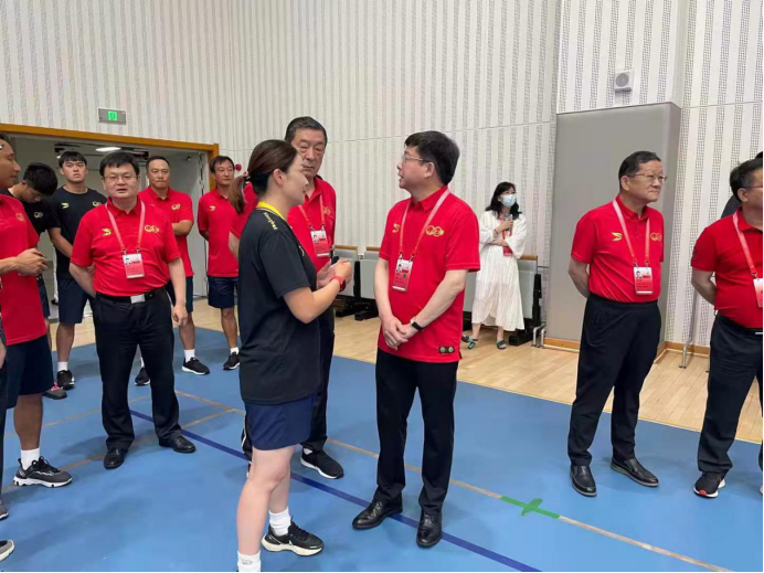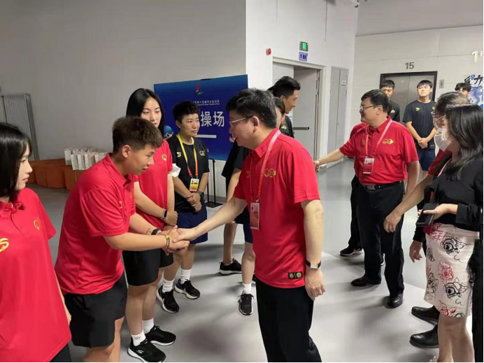 本网讯 7月13日,上海市副市长陈群,上海市教委主任王平,上海市大学生体协会长薛明扬,上海市教委副主任倪闽景,原上海体育学院院长、上海学生运动会代表团副团长姚颂平,上海市教委办公室主任赵宁,上海市教委体卫艺科处处长陈华和上海市科技艺术教育中心主任陆晔一行,在青岛中学室内体育馆亲切慰问了上海市足球代表队。其中,上海市大学生女子足球代表队是由我校为班底的15名球员组成,由我校体育教育训练学院党委书记徐烈担任领队,体育教育训练学院教师叶志竞担任主教练。昨天小组最后一场比赛,上海参加的三支足球队伍均以小组第一的身份进入前8名。陈群在慰问时讲道,记得2017年刚到上海担任副市长时,天津全运会上我们上海足球男女足都拿到了冠军,实现上海足球大满贯,也希望这次能再创辉煌!