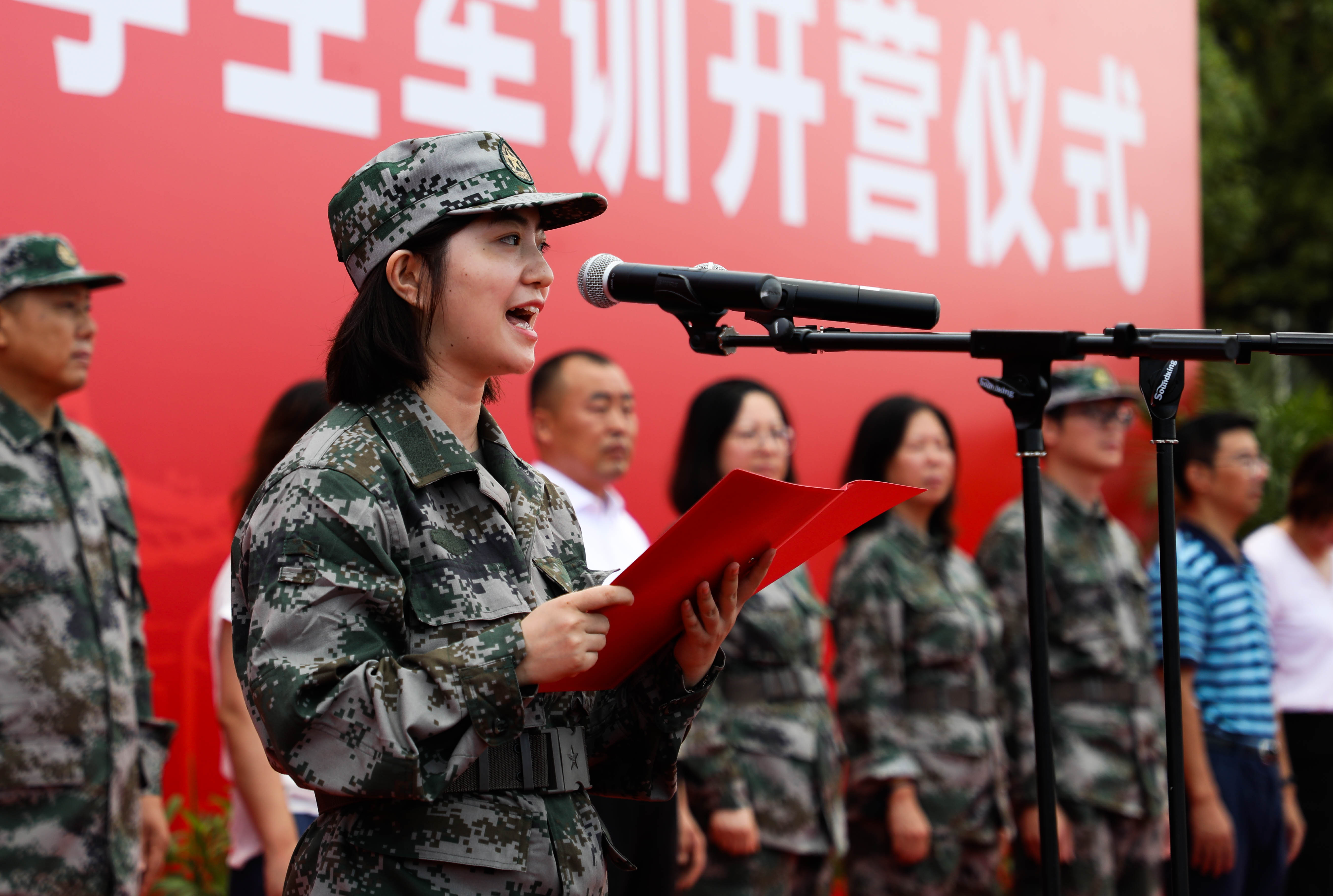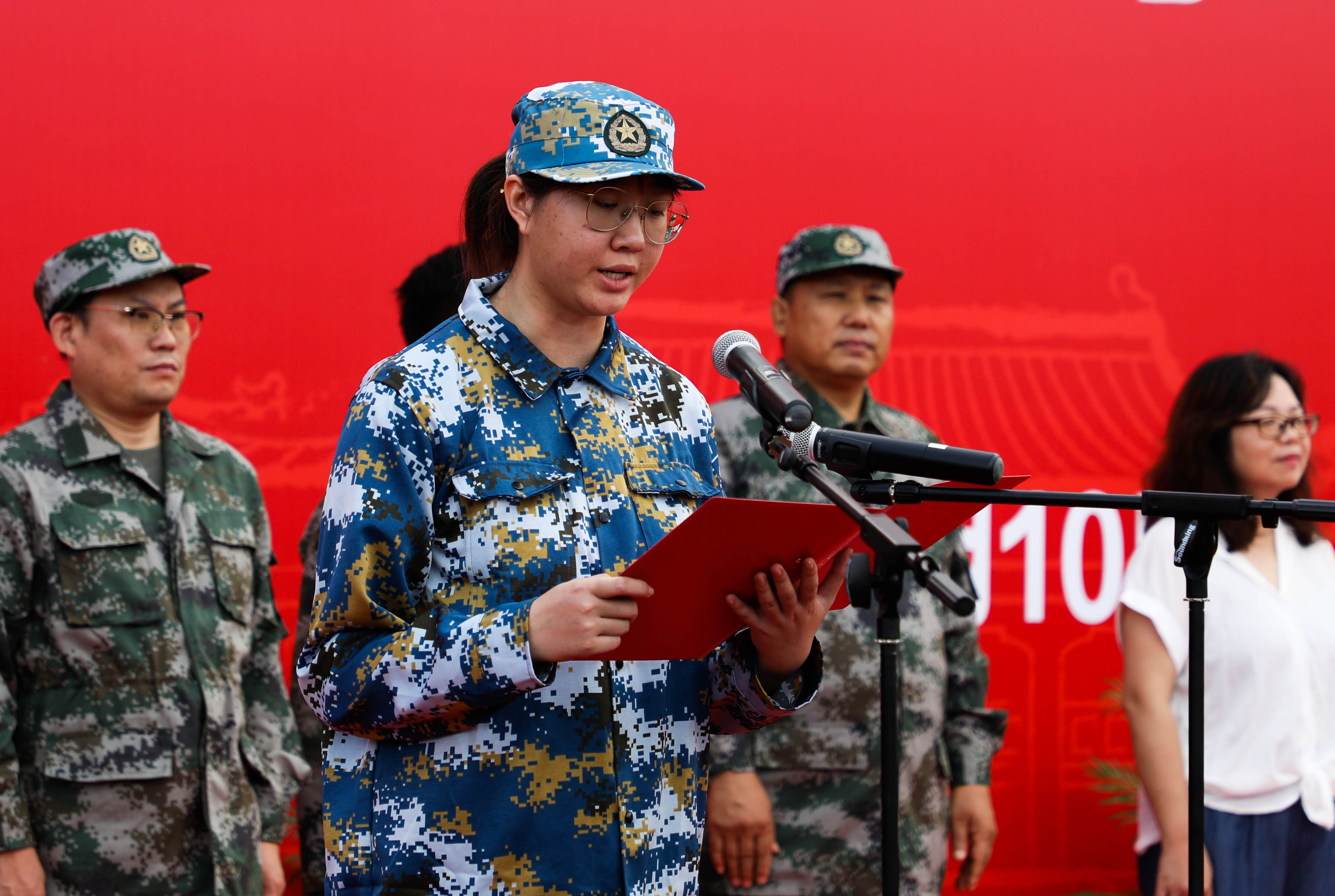 来自体育教育训练学院的新生代表陈玲蓓同学表达了对军训的美好憧憬,并代表新生表态:必定秉承“身心一统,兼蓄竞攀”的校训,以昂扬的斗志,将以饱满的热情投入到军训中,展现出绿瓦学子奋发向上的精神风貌和青春活力。