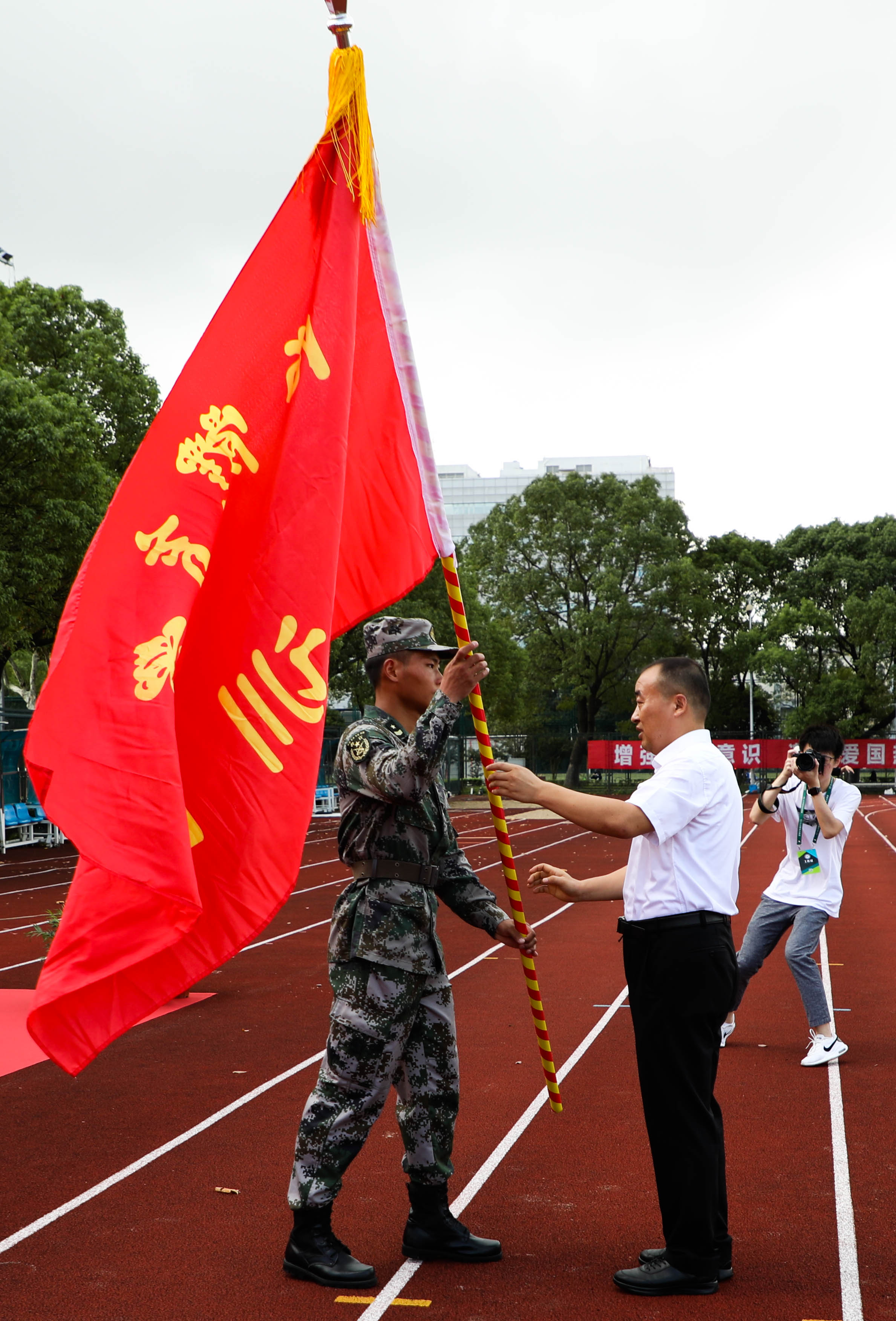 最后,校党委副书记、副院长、军训工作领导小组组长王继红向军训团授旗,宣布本次军训正式开始。