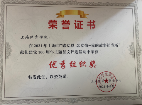 我校学(研)工部积极组织学生参与,经学生投稿、专家评审、学校推荐后报送上海市学生事务中心参赛,最终我校18级体育教育训练学院研究生王炳南获二等奖、19级武术学院本科生孙悦获三等奖、20级传媒与艺术学院研究生舒刘洪获三等奖。我校在此次征文比赛中精心组织、大力宣传、积极报送,获优秀组织奖。