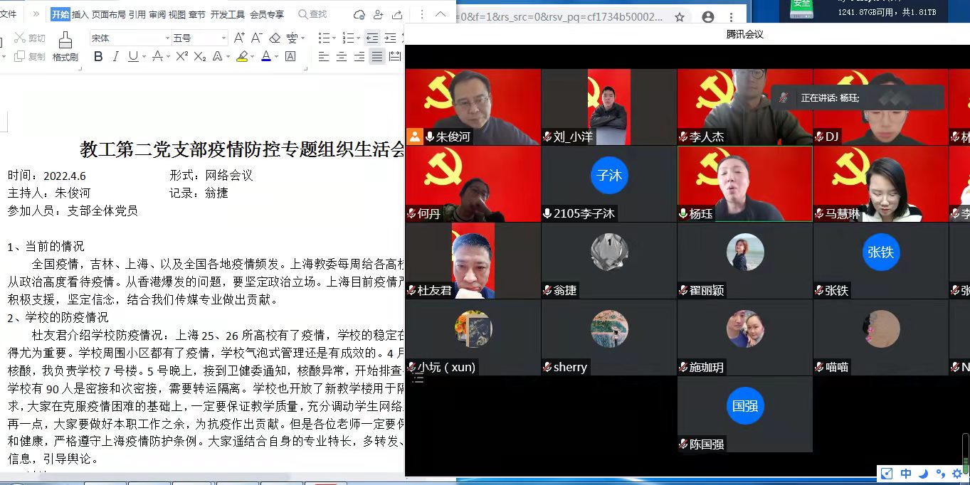 共产党员在哪里,哪里就有一面旗帜。居家隔离的党员在会上介绍了参与社区志愿服务情况。截止到4月8日,我校教职工共有615人在“先锋上海”平台完成社区报到,通过“双报到”在社区工作一线贡献疫情防控力量,在核酸检测、抗疫物资分发、帮扶老人等方面参与了相关工作,充分体现了共产党员的使命担当。