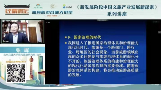 张辉教授的讲座主题为《我国旅游发展的新格局》,从新时代、新趋势、新格局三个方面展开关于中国旅游业发展的探讨。