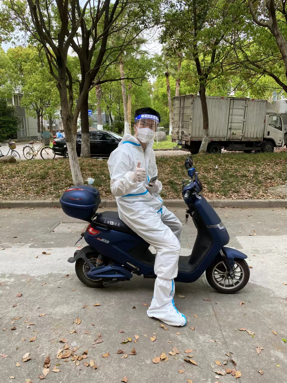 教学部教师顾楠在宝山区大场镇社区担任物资分发和小区快递志愿者,帮助团长们打通最后100米,将货物送到居民手中。