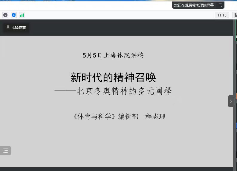 专题学习第一阶段,程志理主编做了题为《新时代的精神召唤——北京冬奥精神的多元阐释》报告。程志理从哲学、史学、文化学等学科视角出发,围绕北京冬奥精神是民族的凝聚力、北京冬奥精神与国民思想政治教育的互构、北京冬奥精神“追求卓越”承继了奥林匹克精神身心完善的理念、北京冬奥精神深刻地揭示了奥林匹克运动文化庆典的内涵、北京冬奥精神与奥林匹克新格言的内在一致性等一系列问题对北京冬奥精神进行了多元阐释。他指出,看似相隔两极的体育运动和哲思精神在社会发展的现实世界里,最形而下的身体运动中,充溢着最形而上的高远玄思,两极原本相通,北京冬奥精神是身心合一精神灌注的信念。他最后强调,北京冬奥精神是新时代中国人的奋斗目标,尽善尽美的人生准则,也是中国梦的明晰化表述。北京冬奥会口号“一起向未来”映照了国际奥林匹克运动“更团结”的新格言,是中国人对奥林匹克主义的贡献。体育运动是国之重器,代表着文化正统。世界不能没有体育运动,体育运动为世界树立文化存在。