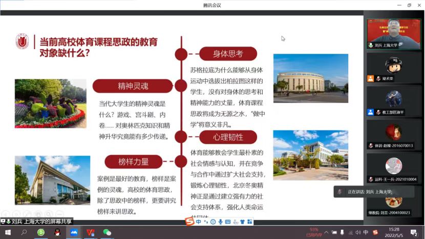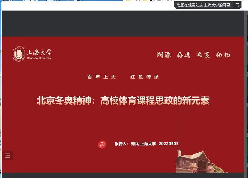专题学习第二阶段,刘兵教授做了题为《北京冬奥精神融入高校课程思政的理论与实践》报告。刘兵从北京冬奥精神与高校体育课程思政关系切入,旗帜鲜明指出现实条件下当前高校体育课程思政课教育对象和教育者面临的缺失和不足,阐述北京冬奥精神融入思政课的理论和实践问题。他认为,北京冬奥精神是一本具有价值引领的思想政治教育教科书,“胸怀大局、自信开放、迎难而上、追求卓越、共创未来”是其中的逻辑篇章;是体育强国建设的重要引领,是吸引全社会共同参与建设与发展的民族复兴梦想的价值培养;通过北京冬奥精神和中华体育精神努力追求并积极构建人类命运共同体,实现一起创造未来的共同梦想是最终指向。他强调,实现北京冬奥精神向高校体育课程思政内容的转化,要善用体育思政课程平台、善追体育精神与典故、善抓优秀运动员榜样、善取体育精神价值。最后,他通过引用上海大学老校长钱伟长和诺贝尔文学奖获得者莫言对体育的理解,指出体育课程思政大有可为也必将大有作为。