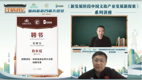 本网讯 5月7日下午,国务院学位委员会工商管理学科评议组成员白长虹教授应邀做客我校“经精讲坛•体育旅游名师大讲堂”第四讲,讲座由经济管理学院院长李海主持。白长虹教授是国务院学位委员会第八届学科评议组成员(工商管理旅游管理),南开大学商学院院长、旅游与服务学院创始院长、《南开管理评论》主编,中国专业学位案例建设咨询委员会委员。他主要研究领域有包括旅游与服务业管理、品牌管理、数字化教育等,本次带来的讲座题为《智能时代的幸福产业》,直播期间共吸引了千余人次观看。