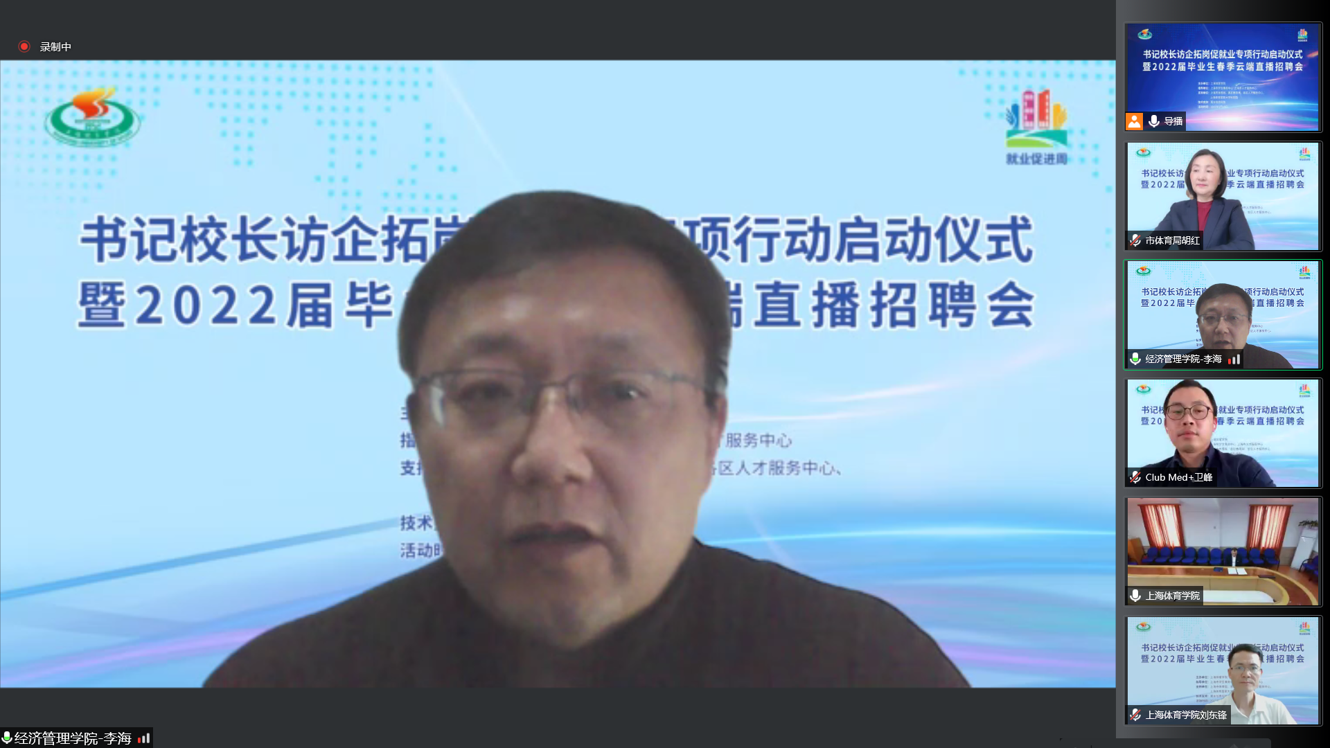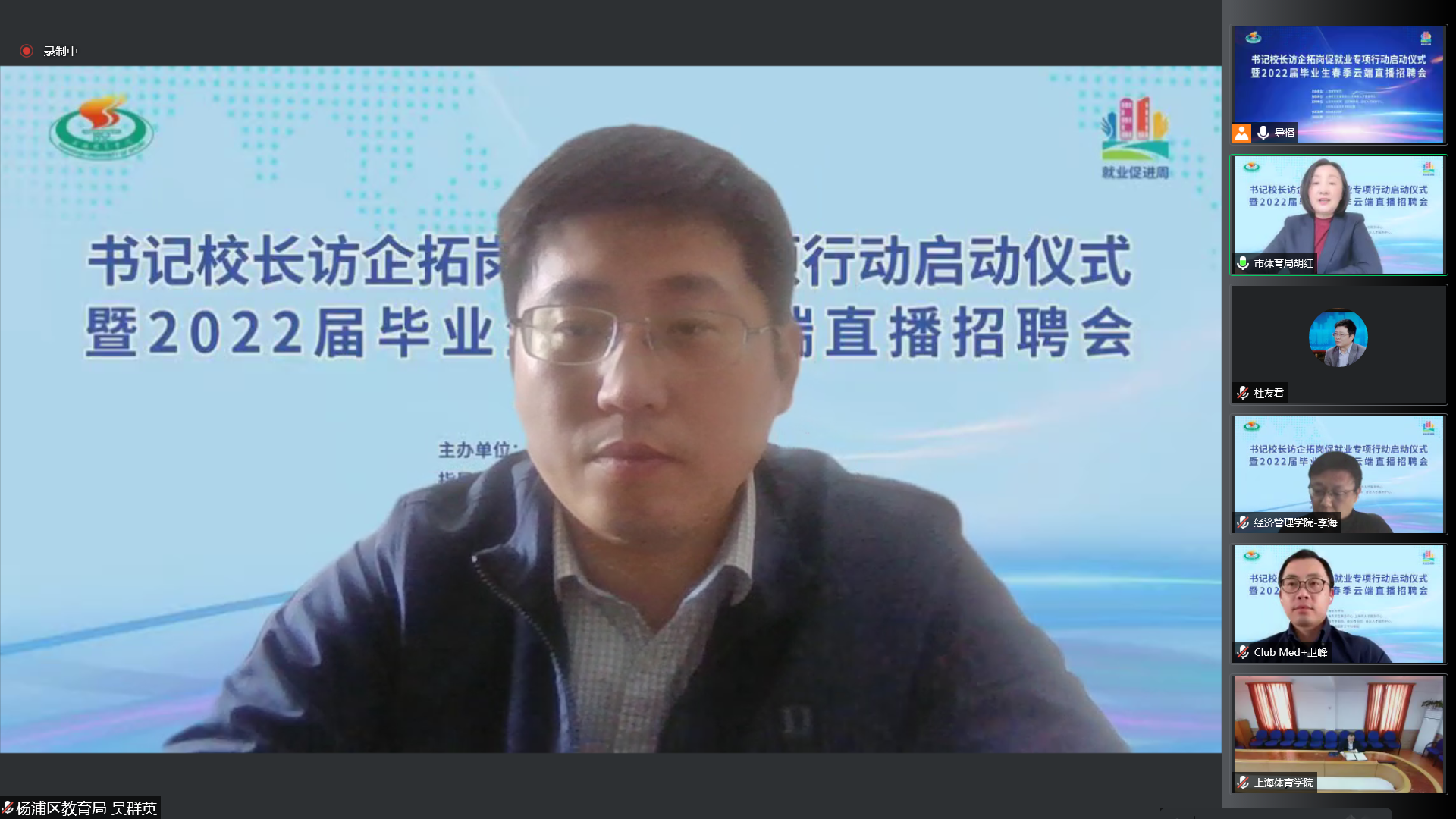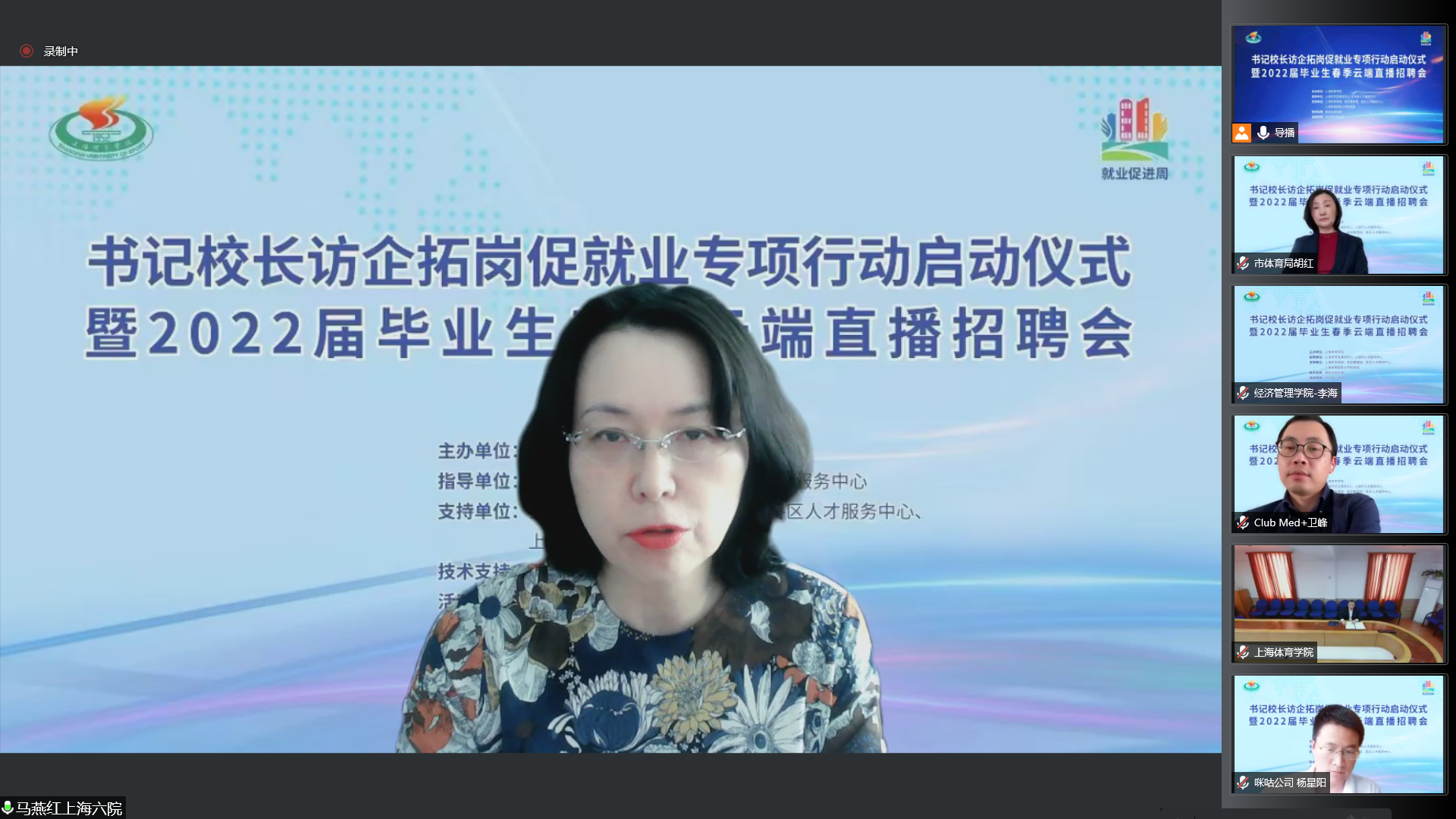 上海市体育局、各区教育局领衔55家相关事业单位及74家优质企业相聚云端,与上海体育学院就加强合作共赢、资源共享,深入拓宽就业渠道,挖掘就业岗位,共同促进毕业生就业达成共识。