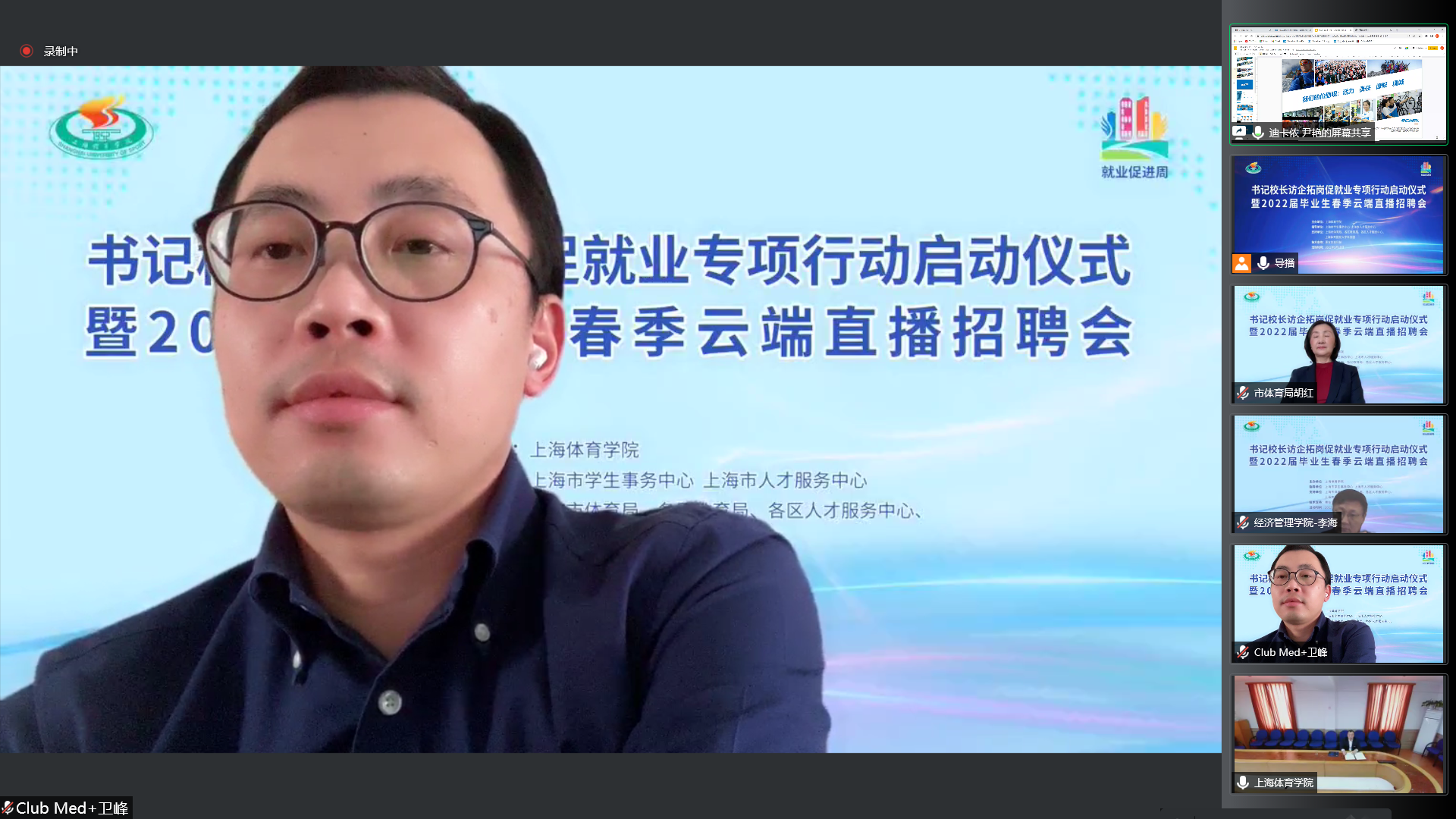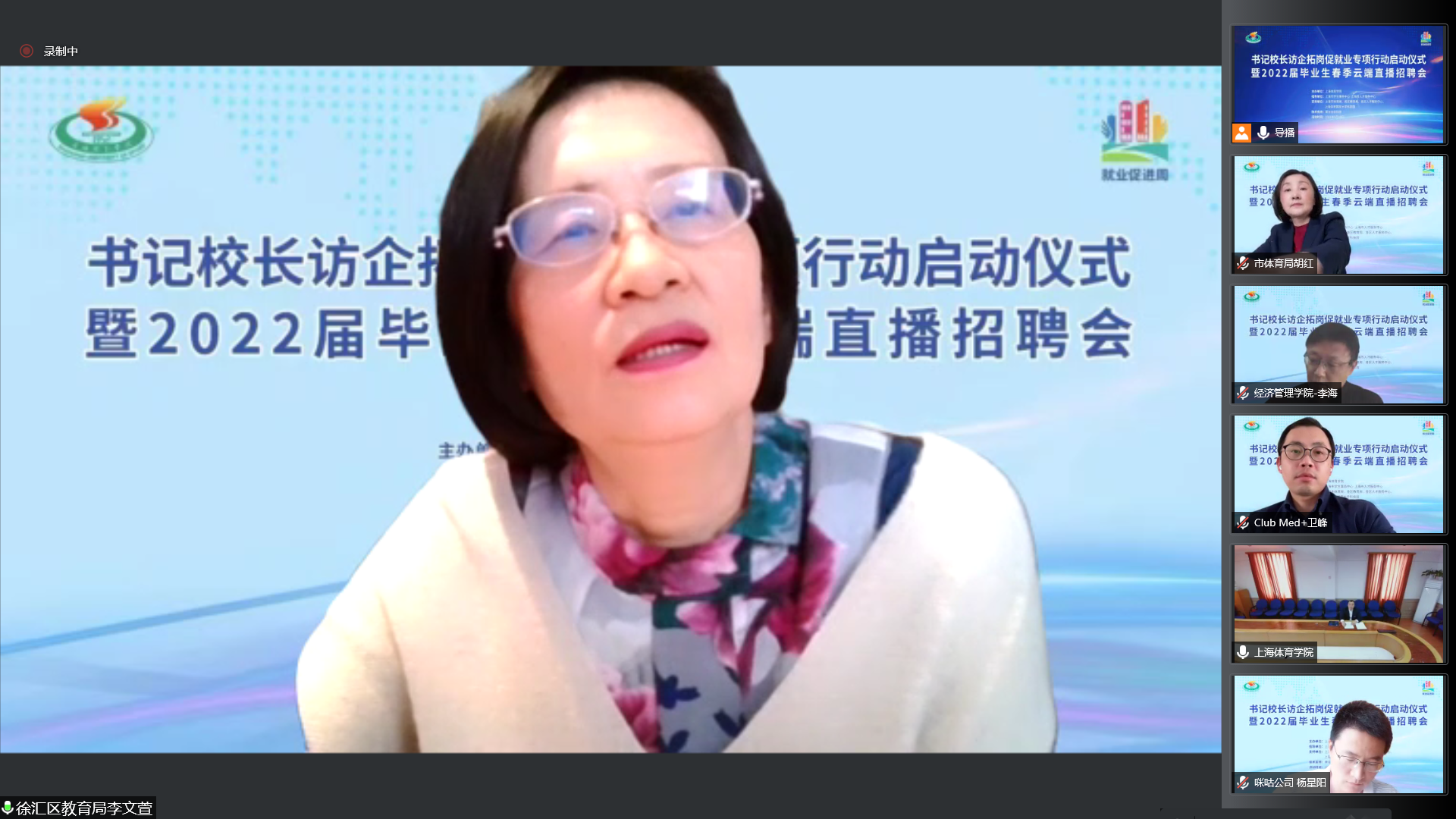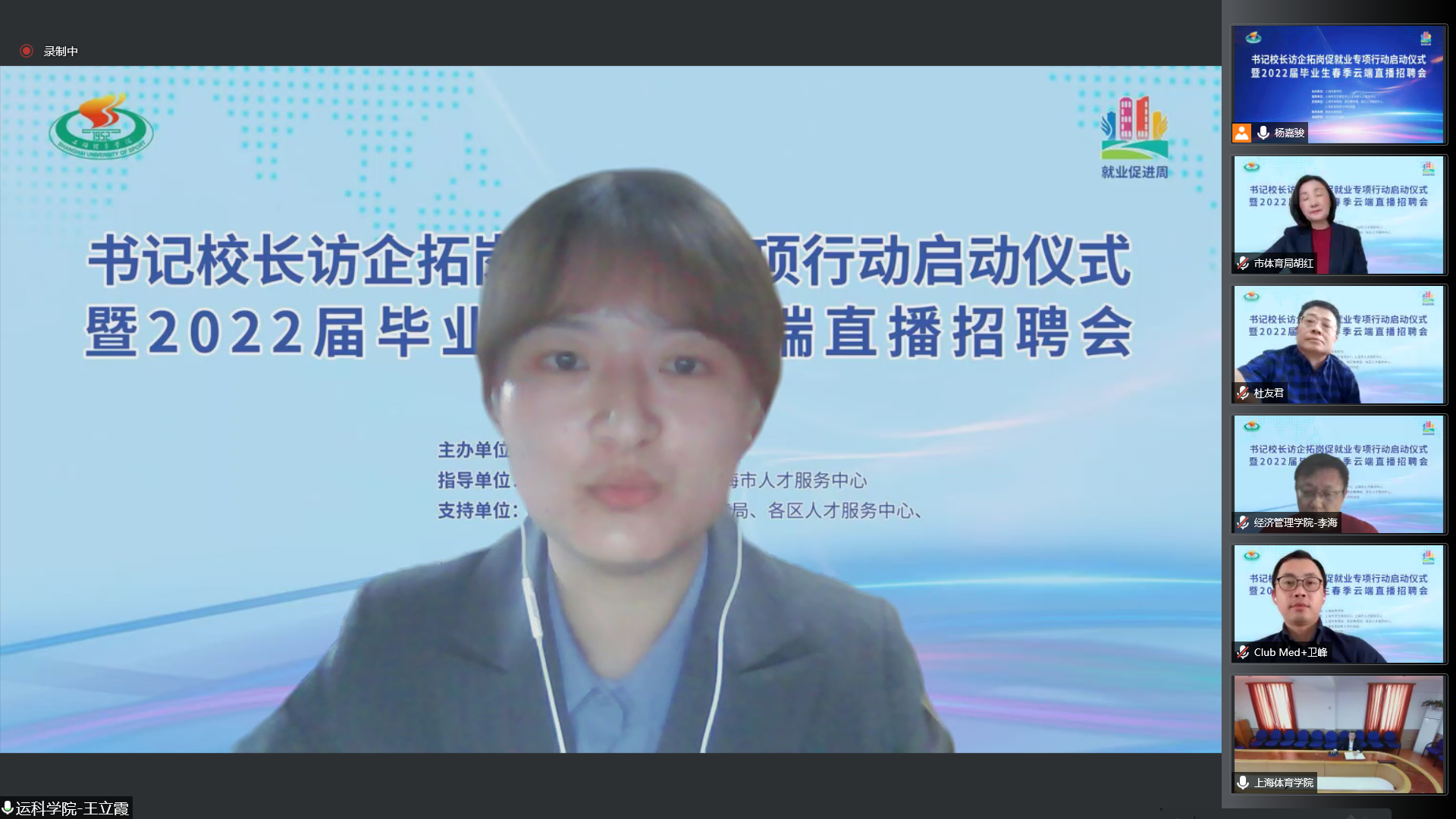 上海市体育局、各区教育局领衔55家相关事业单位及74家优质企业相聚云端,与上海体育学院就加强合作共赢、资源共享,深入拓宽就业渠道,挖掘就业岗位,共同促进毕业生就业达成共识。