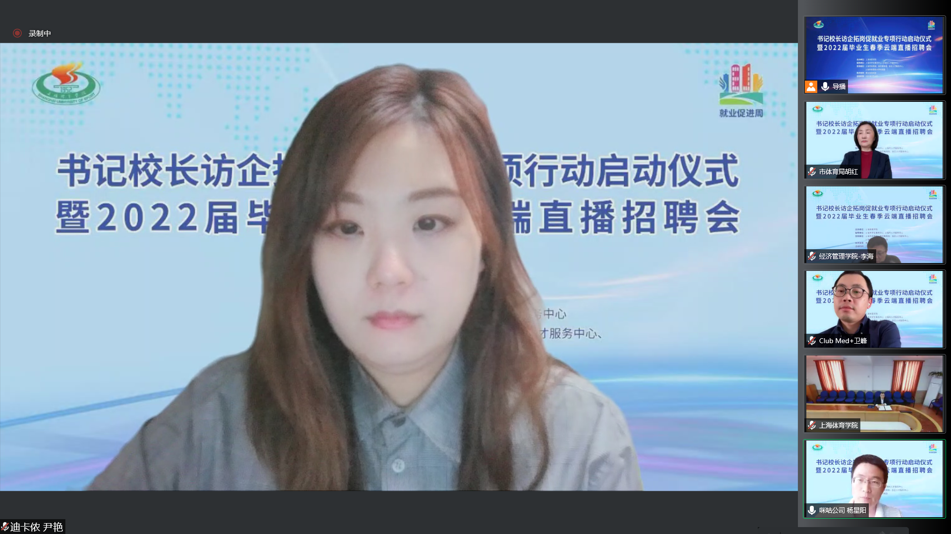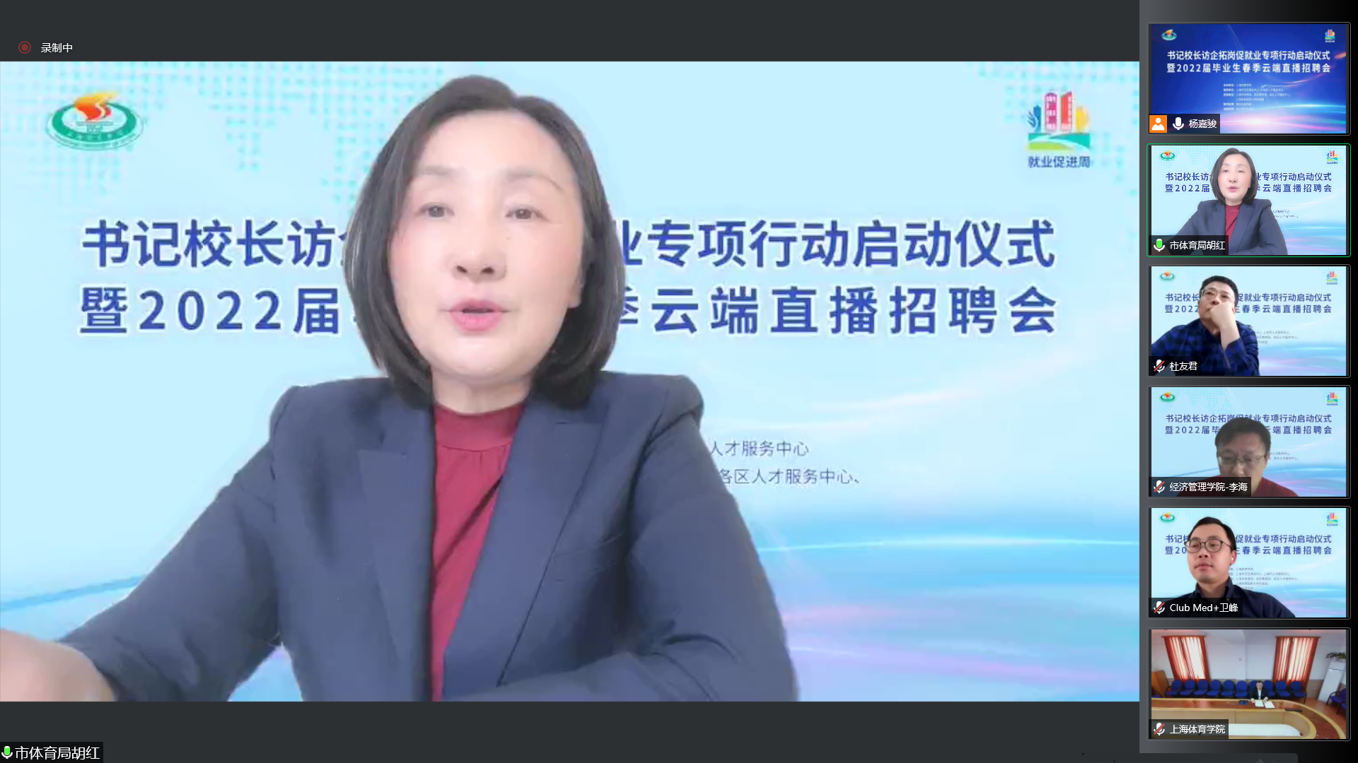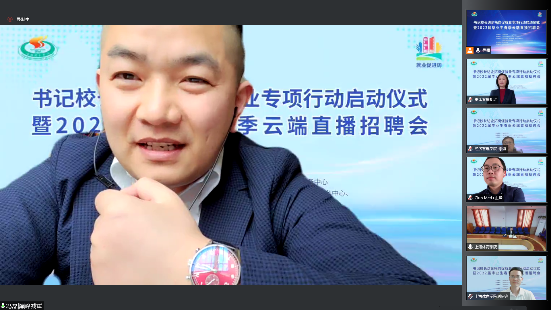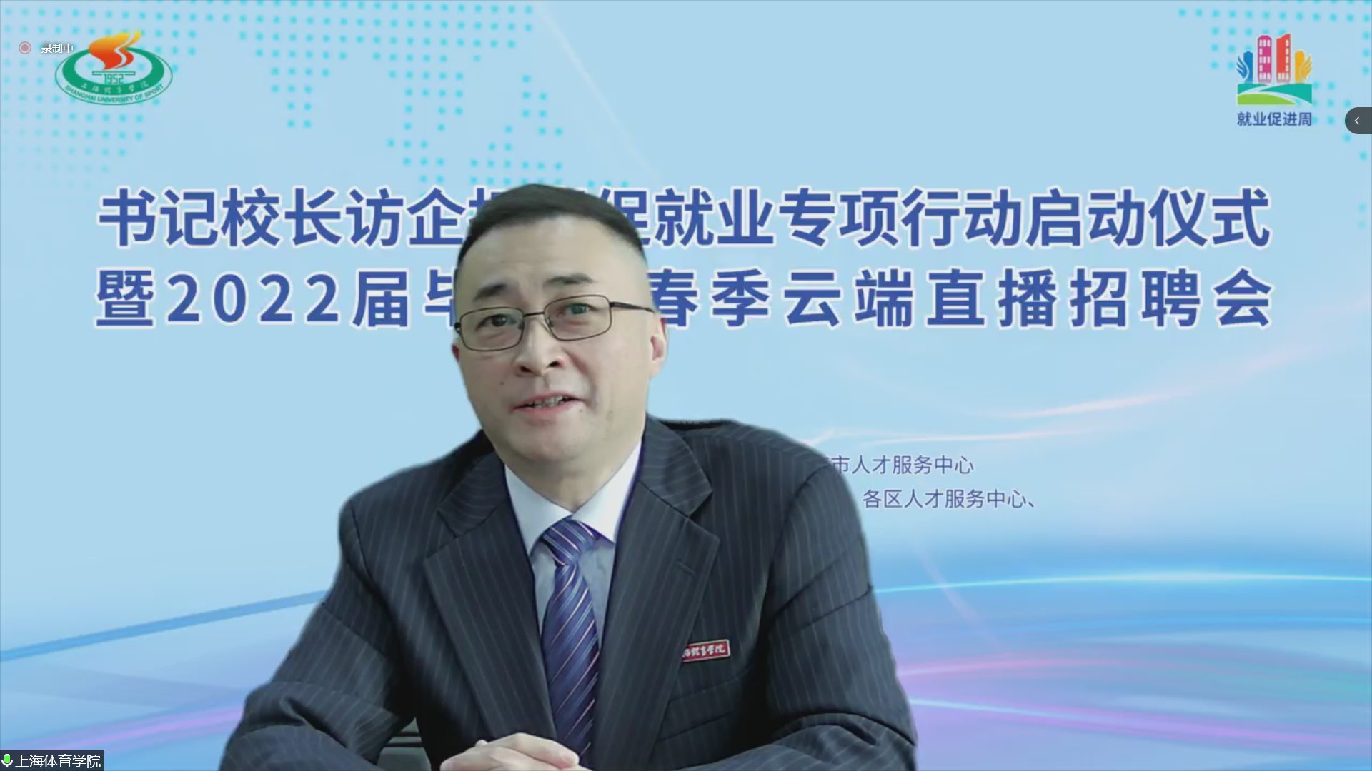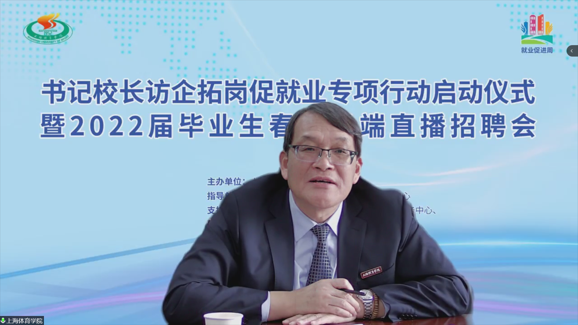 本网讯 近日,教育部部署开展全国高校书记校长访企拓岗促就业专项行动和“百日冲刺”系列活动。为满足各位毕业生的求职需求,最大程度降低疫情带来的影响,全力促进我校2022届毕业生更加充分更高质量就业。5月18日,上海体育学院书记校长访企拓岗促就业专项行动启动仪式暨2022届毕业生春季云端直播招聘会举行。校党委书记李崟、校长陈佩杰出席活动并积极向企业推荐我校毕业生。招聘会由党委副书记、副校长王继红主持。