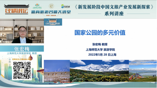 本网讯 5月28日下午,《旅游科学》主编张宏梅教授应邀做客我校“经精讲坛•体育旅游名师大讲堂”第七讲,讲座由经济管理学院院长李海主持。张宏梅教授同时也是上海师范大学旅游学院副院长,上海师范大学工商管理高原学科负责人,工商管理一级学科硕士点建设委员会主任委员,上海旅游高等专科学校副校长,在《Tourism Management》《旅游学刊》等国内外学术期刊发表论文100余篇,荣获省部级奖项4项,入选爱思唯尔2021年工商管理学科“中国高被引学者”榜单。她本次带来的讲座题为《国家公园的多元价值》,直播期间共吸引了千余人次观看。