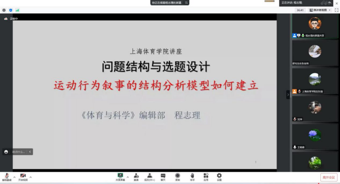 在讲座中,程志理教授首先对体育作为学科发展的简史进行了回归,提出从上个世纪80年代中期开始,体育学在“体认”范式下开启了向行为学的初步转向,随后,他围绕“运动行为叙事的结构分析模型如何建立”这一问题进行了阐述,认为体育学的研究对象需要从最开始的研究人体转变为研究人的运动行为,并有必要引入“行为叙事”的方法,而在行为叙事中,最重要的就是让主体的概念得以呈现,用行为叙事的方法去做体育学的行为叙事方向,意义就在于以切身感的诠释,用体验去理解,并强调了“身体感”在运动训练中的重要作用,认为运动技术身体感是非客观化的事件,必须与主体有关,不能用数据来判断,并列举了部分著名运动员的实例讲述行为叙事方法在运动训练中的实际运用。在问答环节,程教授还与主持人和广大师生进行了热烈的讨论与互动。