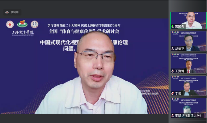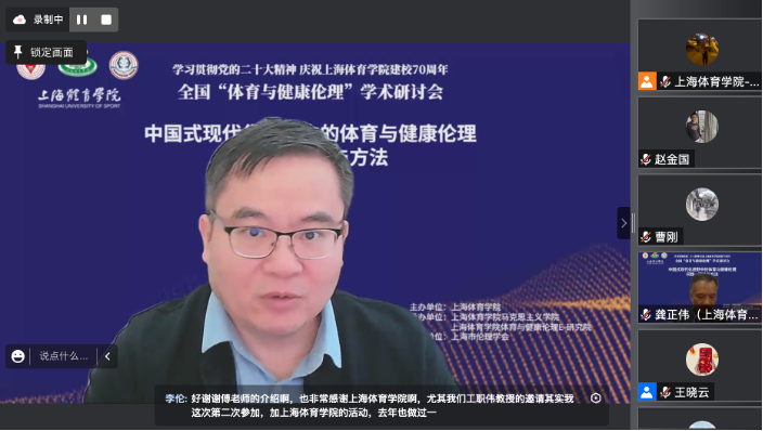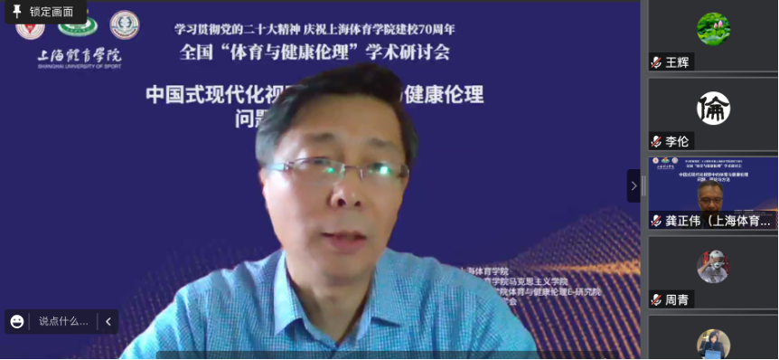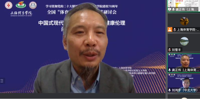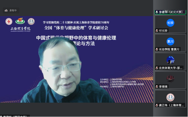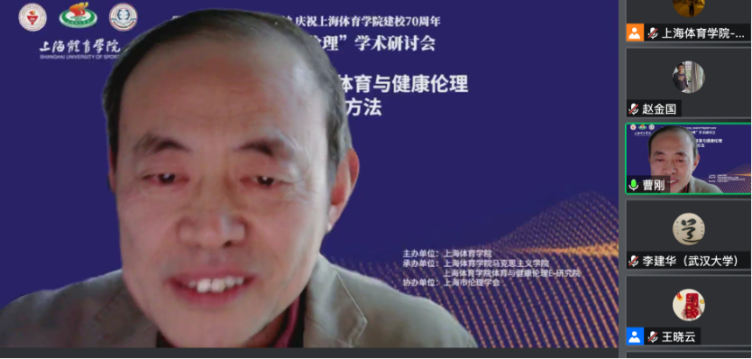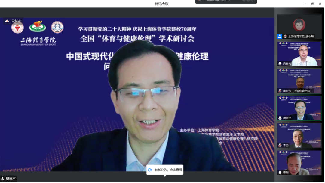 本网讯 为深入学习贯彻党的二十大精神,11月12日,由上海体育学院主办,上海体育学院马克思主义学院和上海体育学院体育与健康伦理-E研究院联合承办,上海市伦理学会协办的全国“体育与健康伦理”学术研讨会在腾讯会议平台举行,此次研讨会也是庆祝上海体育学院建校70周年系列学术活动。上海体育学院党委书记李崟,中国伦理学会副会长、中国伦理学会法律伦理学专业委员会名誉主任、中国人民大学伦理学与道德建设研究中心主任、哲学院曹刚教授,上海市伦理学会会长、复旦大学马克思主义学院高国希教授出席开幕式并致辞。开幕式由上海体育学院马克思主义学院院长胡德平教授主持。