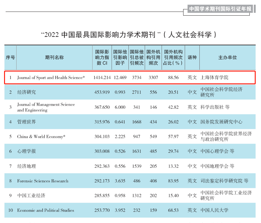 本网讯 12月5日,由中国知网和清华大学图书馆联合研制的《中国学术期刊国际引证年报》(2022版)(以下简称“年报”)发布,并公布了“2022中国最具国际影响力学术期刊”名单。我校主办的《运动与健康科学(英文)》(Journal of Sport and Health Science, JSHS)连续8年在2000余种人文社会科学期刊中排名第一,继续蝉联“中国最具国际影响力学术期刊”称号。