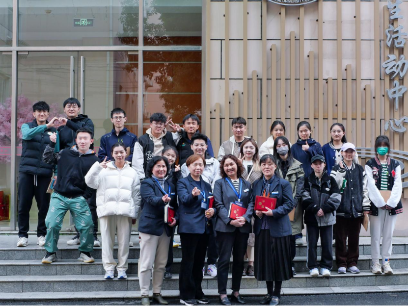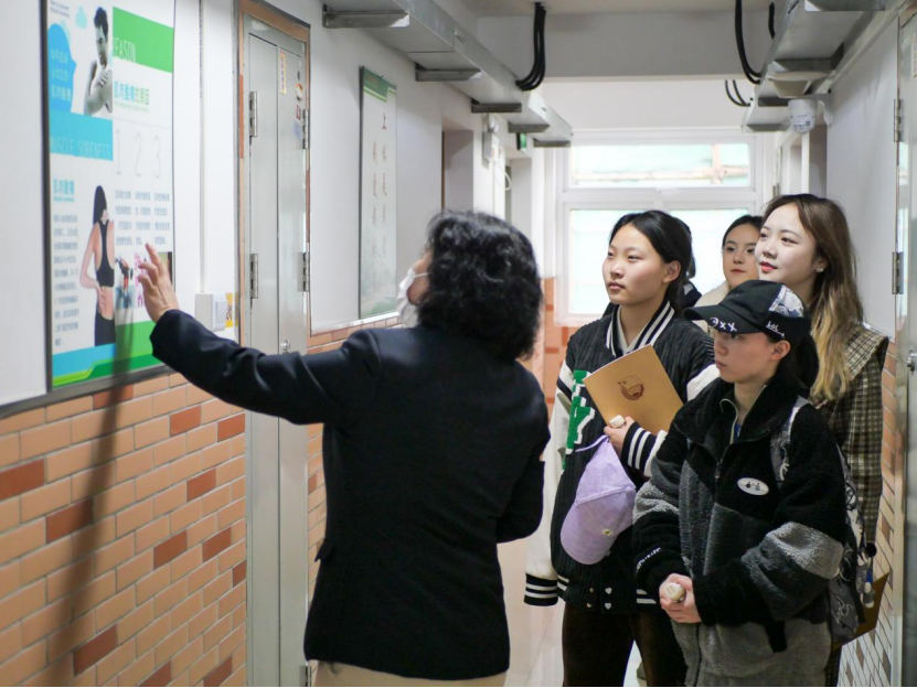 在袁老师为同学们讲述了上体宿舍的基本情况之后,金娟、刘晓春、李小芳、缪海庆四位宿管阿姨分别上台进行了自我介绍,简单地介绍了她们各自所负责的楼宇以及楼宇的基本情况,讲述各自的管理理念和与学生相处的方法,在介绍的过程中四位阿姨都讲了许多发生在宿舍的温情故事,让参与本次实践学习活动的同学都从她们的言语和行动中感觉到宿管阿姨为了我们营造家一般的宿舍的决心与恒心。在学生活动中心门口进行了集体的合影留念后,对参与活动的学生进行了分组,学员们分别跟随四位宿管老师进入到学生宿舍体验学习宿管阿姨的每日工作。