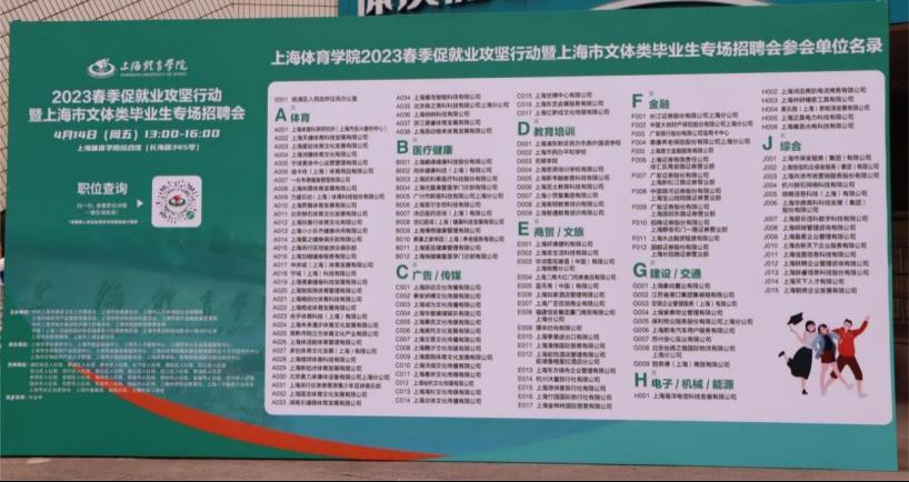 本网讯 4月14日,上海体育学院2023春季促就业攻坚行动暨上海市文体类毕业生专场招聘会在我校综合馆举行。本次招聘会由上海市教育委员会主办,上海市学生事务中心、嘉定、青浦、松江、奉贤、南汇五大新城人力资源主管部门及上海体育学院联合承办。