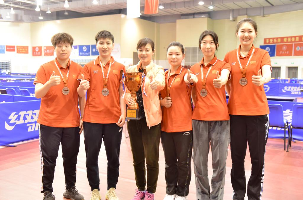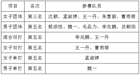 中乒院学子代表上海体育学院出战,顾楠、张琴两位中乒院老师带领男、女队员参赛。比赛中我院学子不畏强敌、敢打敢拼、斗志昂扬、奋力拼搏,不仅打出了极高的竞技水准,而且展现了蓬勃向上的精神风貌,取得了女子团体第三名、男子团体第五名等一系列好成绩。同时,我院参赛运动员殷添悦、王一丹荣获体育道德风尚奖,教练员顾楠荣获体育道德风尚奖。