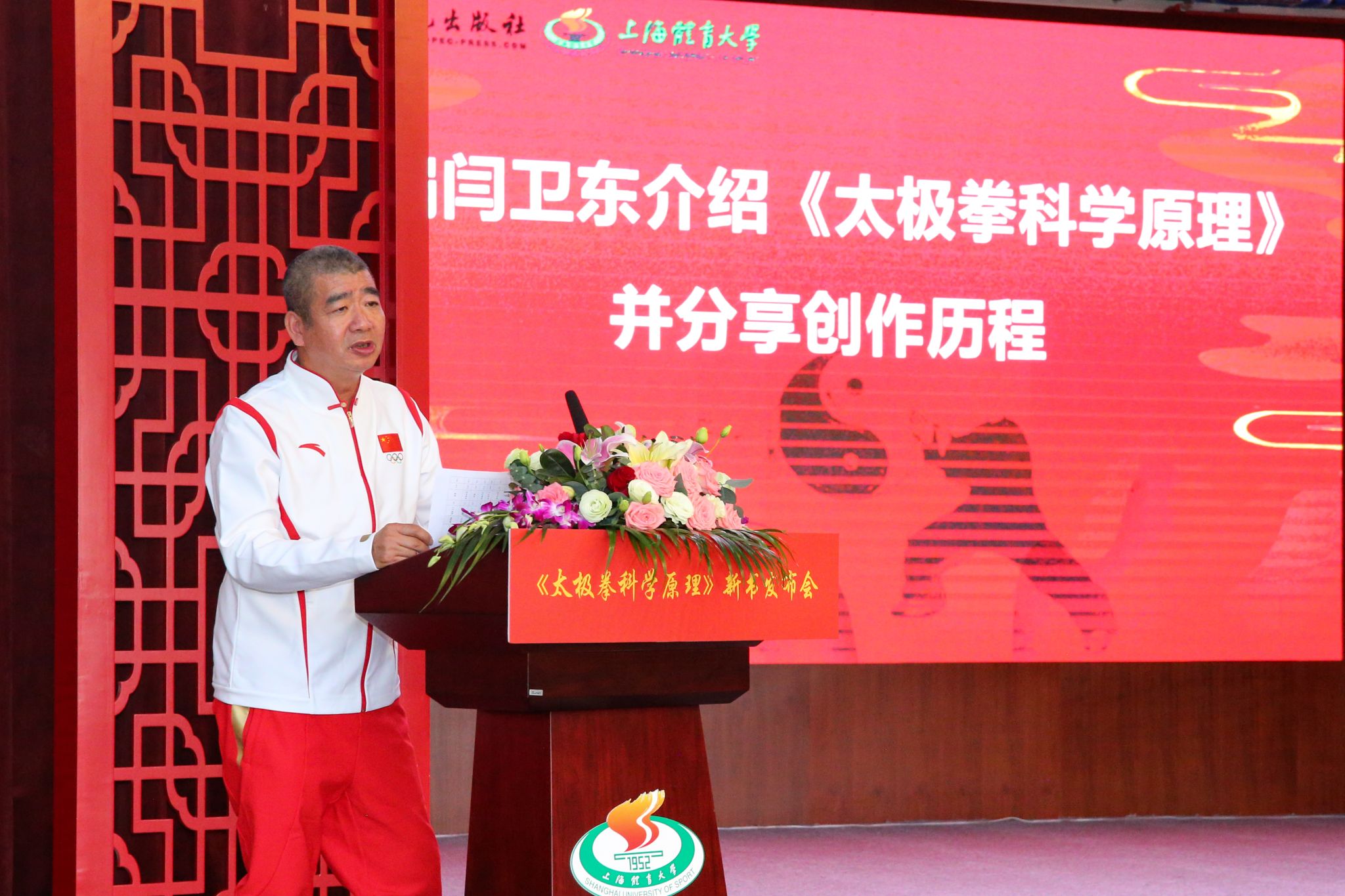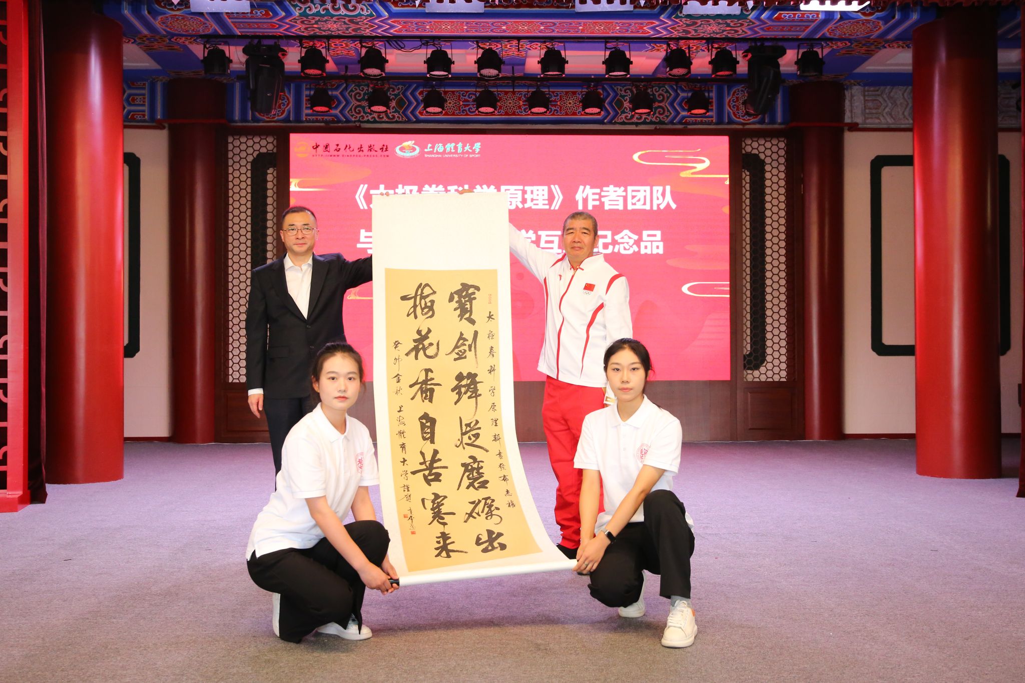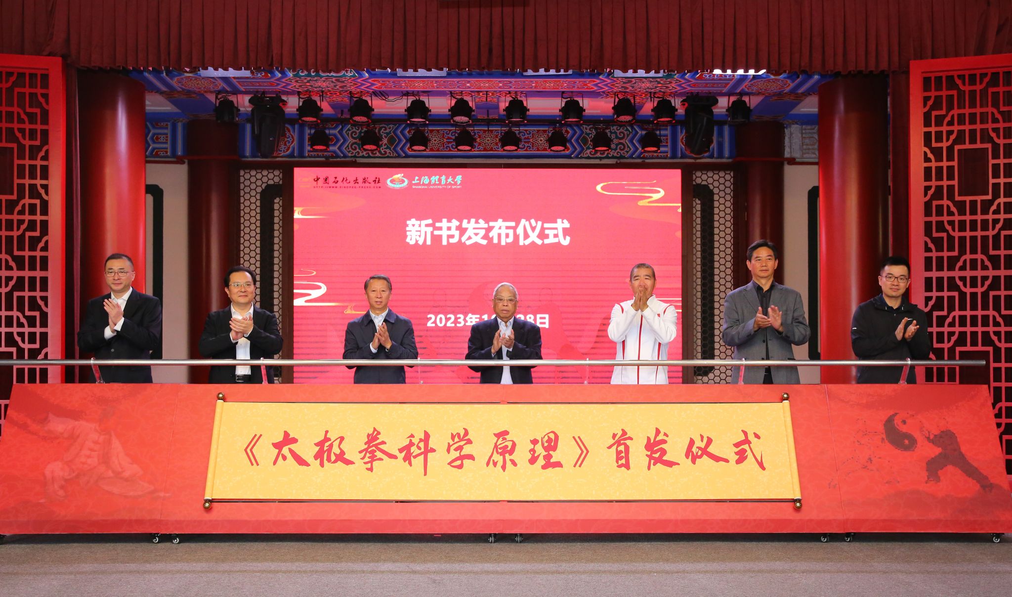 中国工程院院士、中国石油化工股份有限公司原总裁王基铭,中国石油化工集团有限公司原董事会秘书、党群工作部主任周恒友,中国石化出版公司执行董事、党委书记周志明,全国政协人口资源环境委员会办公室(四局)原一级巡视员、《太极拳科学原理》主编闫卫东,上海市教卫工作党委书记沈炜,中信出版集团股份有限公司总经理、副董事长陈炜,永利3544am登录官网党委书记李崟等7位领导为《太极拳科学原理》推杆揭幕。