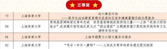 此外,运动健康学院《“运小康在行动”——数字化运动康复新模式促进社区老年健康暑期实践志愿服务》、体育教育学院《雪域高原辉映绿瓦青年忠诚 世界屋脊铸就民族团结力量——上体“民族大团结组合”赴西藏日喀则地区第九次“固边强国”主题教育暨少数民族传统体育文化调研专项行动》、新闻与传播学院《上海市凝聚力工程文集采访服务》、武术学院《“寻访·共识·赓续”——上体武术青年体育非遗志愿实践团》4个项目荣获市级三等奖。