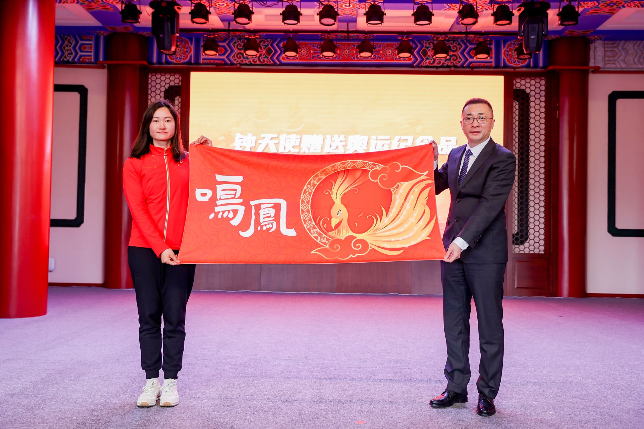 钟天使向学校赠送奥运会同款鸣凤毛巾。