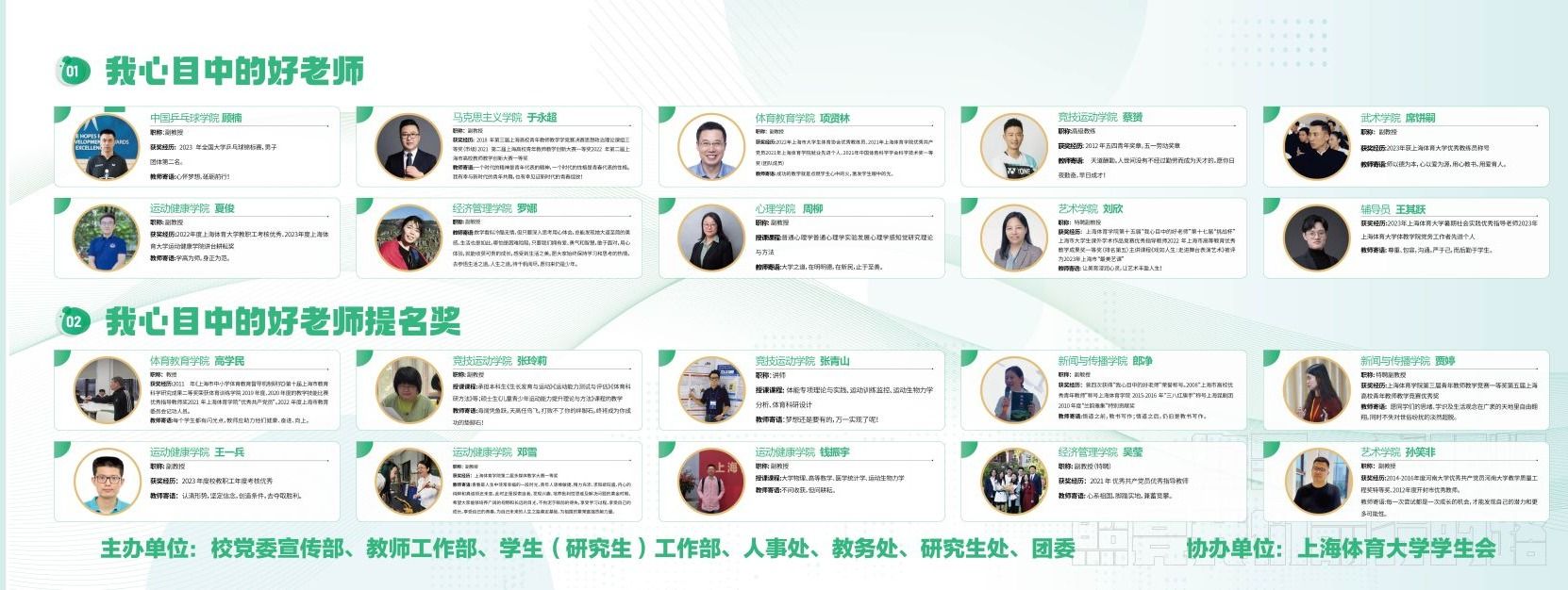 师道永恒,薪火相传。每一位“好老师”将继续做“传道授业解惑”的新时代良师,为师大学子的成长成才保驾护航。学校也将持续深化师德师风建设,通过各种形式营造尊师重教的浓厚氛围,努力打造未来教育家的摇篮,为学校早日建设成为世界一流体育大学更大贡献。