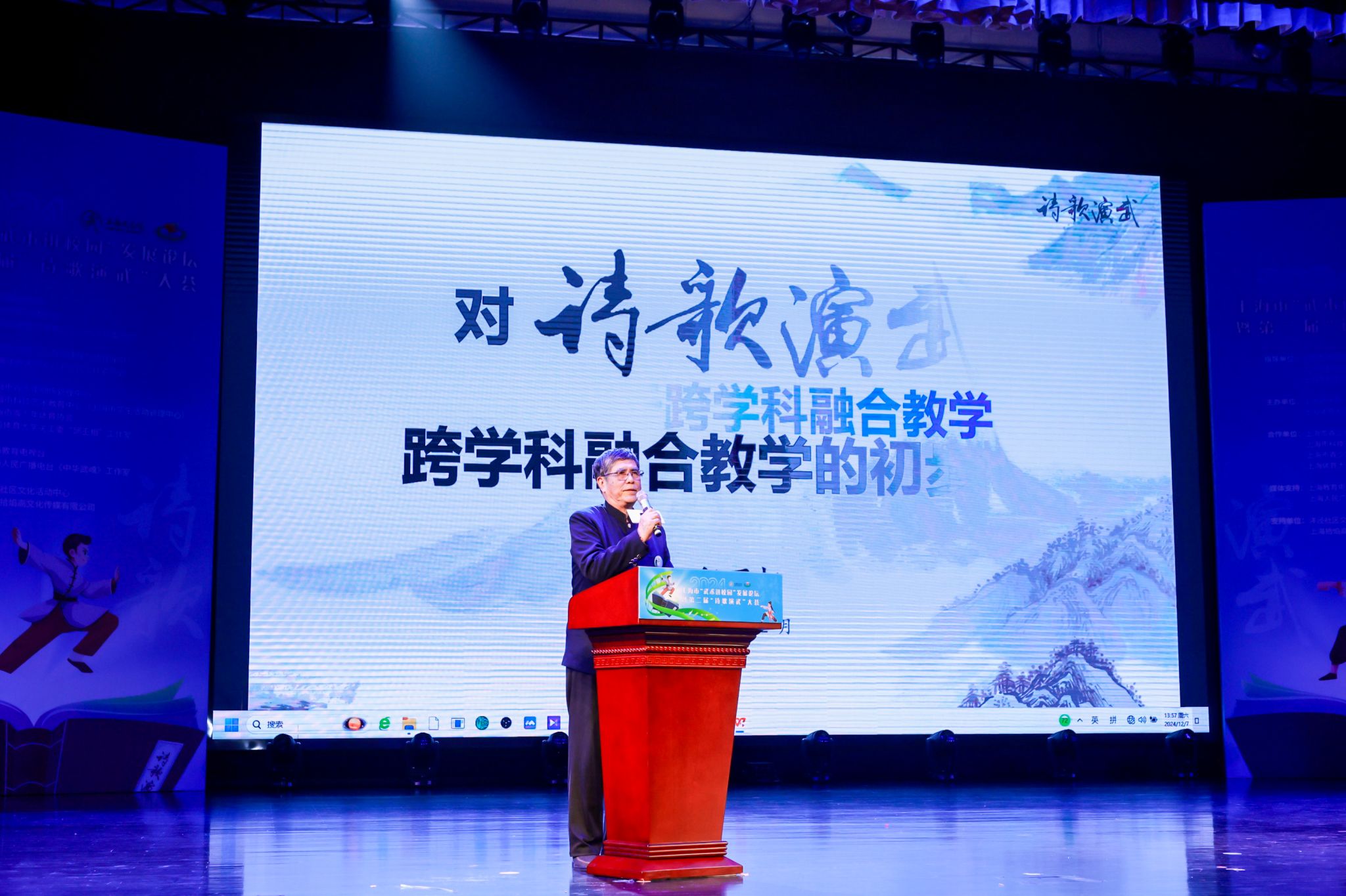 在“武术进校园”发展论坛上,永利3544am登录官网博士生导师、中国武术九段、中国武术十大名教授、市教育系统关工委“邱丕相工作室”负责人邱丕相受邀作题为《对“诗歌演武”跨学科融合教学的初步探索》主旨报告,深入剖析了在关心下一代工作中实施的“诗歌演武” 这一创新性与前瞻性兼备的教育实践探索,阐述了武术教育在“五育并举”中的实践经验。